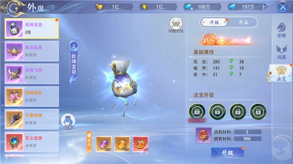游戏内的外观形象,既能通过进阶解锁,也能使用道具激活幻化形象。对于已解锁的法宝形象,玩家可以自由选择进行幻化。