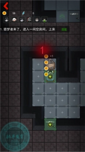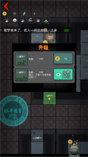 5、倒计时还剩5秒时先升级床,接着把2级门升上去;要是鬼先来攻击我们,就先造武器,之后再升级门,门快被打破的时候可以点击修复键。
