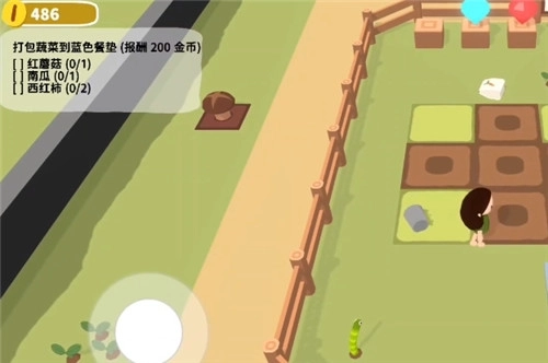 2、如上图所示,任务是把蔬菜打包到蓝色餐垫里,这时候我们只需操控角色,将前面提到的蔬菜都种植下去就可以了。