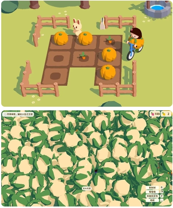 种地!作为刻在DNA里就带着种田基因的中国人,一款带种地系统的游戏对我绝对有巨大吸引力,尤其是能玩出花样的种地玩法。在这款游戏里,玩家可以种萝卜、花菜这类农作物,浇水后等它们长成成品就能拔——必须狠狠拔萝卜!收获的蔬菜能换硬币开扭蛋机,不过有些蔬菜(比如番茄、南瓜)没法收进背包,得放进小推车才行。游戏里部分蔬菜还能种成巨型作物:巨大胡萝卜和巨大番茄能用来做衣服,巨大南瓜则可以改造成推车和篮子。另外还有个“bug级蔬菜”花菜,一分能产出一百个,直接给电脑CPU施压,数量一直疯涨根本收不完,像癌细胞扩散似的,玩家都戏称这段体验是“卡卡顿顿花菜时光”。