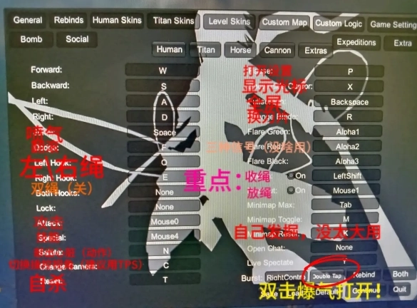 按键设置极其重要,决定着以后我们的游戏方式建议迟早养成良好习惯(建议不用按照我的设置),巨猎圈多数人都是shift喷气空格收绳右键/ALT放绳技能和换刀片鼠标侧键或者一些特殊按钮
