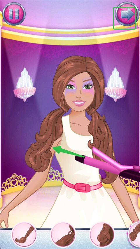 下一步就要来给芭比卷头发了,点击选择发型,然后将卷发棒移至芭比的头发处,然后漂亮的发型就好了,点击箭头进行下一步。