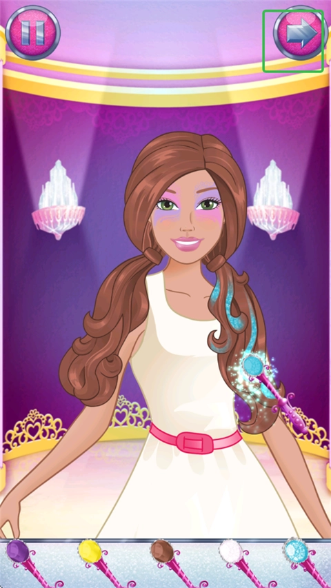 选好形象后,点击进入化妆阶段。玩家可点击选取喜欢颜色的涂料,然后往芭比脸上的图案以及嘴巴进行涂抹,完成后点击右上方箭头进行下一步。