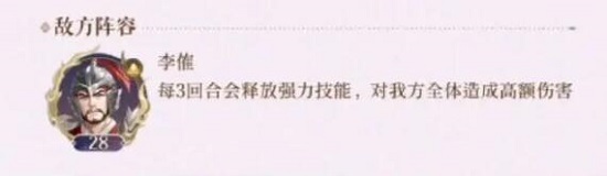 敌方阵容中有李傕,其每隔3个回合便会施展强力技能,对我方全体造成高额伤害。