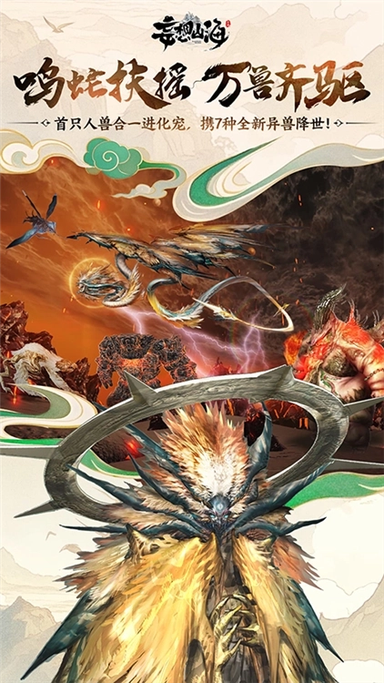 3、【上古异兽,玩法多元】在广阔大世界中,无论是翱翔天际还是穿梭地面的异兽皆可捕捉;通过孵化异兽蛋,能获取坐骑、侍从与伙伴;此外,还有斗兽、吞噬等丰富玩法可供体验。