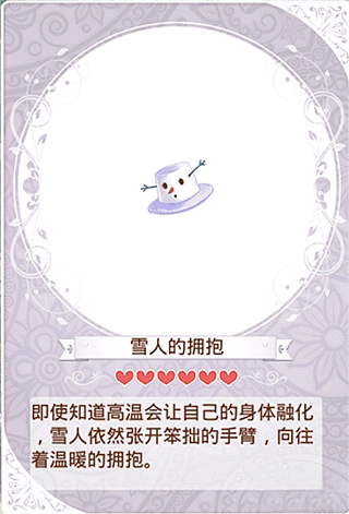 紫色的帽檐上方是白色的雪人脸庞,棕色的眼睛虽不明亮,却透着一股孤单的气息。红色的鼻子看着像是根小小的胡萝卜,棕色的嘴巴微微咧开,仿佛是瞧见了什么新奇的事物。它伸出两条手臂,似是想在凛冽的冬日里,给你一个充满暖意的拥抱。“哪怕清楚高温会让自身融化,雪人依旧张开略显笨拙的手臂,渴望着那温暖的相拥。”