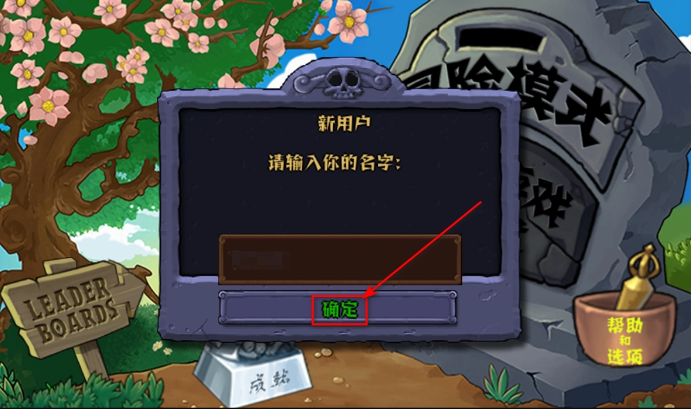 1. 第一次进入植物大战僵尸黑西游版游戏时,得先输入名字,接着点击确定按钮。