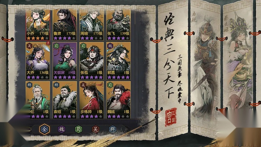 1.阵营选择:游戏中的武将划分为魏、蜀、吴、群四个阵营,玩家能够自主进行培养与升级,构建专属于自己的阵容。