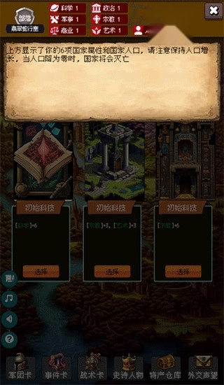 3. 游戏界面顶部清晰展示着国家的各项属性数据,这些数据是决定国家存亡的核心要素,一旦人口数值降至零,国家就会不可避免地走向覆灭。