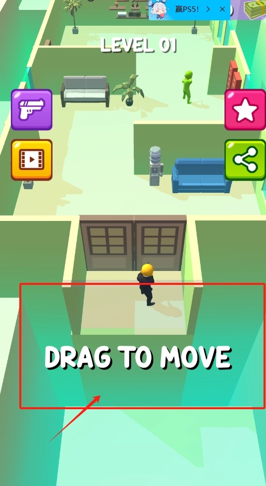 1、黄头盔小人站在房间门口,左上角紫色枪图标可射击,右上角星星图标可能是奖励。拖动屏幕可移动视角,目标是消灭敌人赢取PS5。