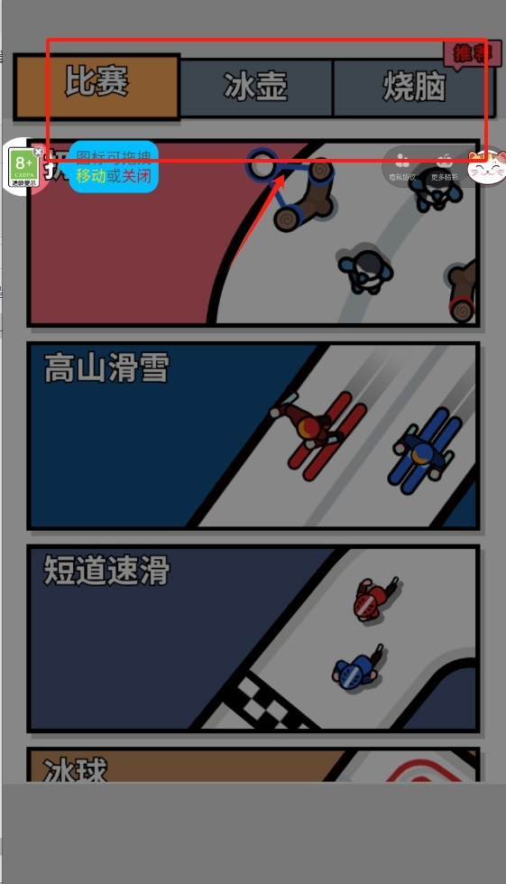2、游戏主界面,顶部有比赛冰壶烧脑三个选项卡。中间展示四个运动项目插图,可切换图标位置,右上角有小头像和功能按钮。