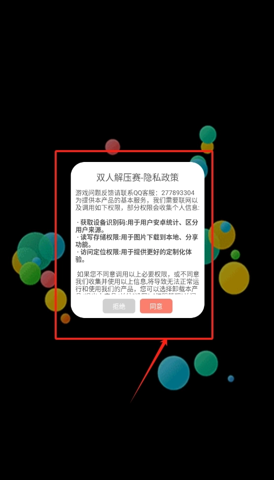 1、这是隐私政策页面,顶部有游戏名和客服QQ。下方列出获取设备信息、存储、定位权限的用途,点红字同意继续,灰色拒绝可卸载。