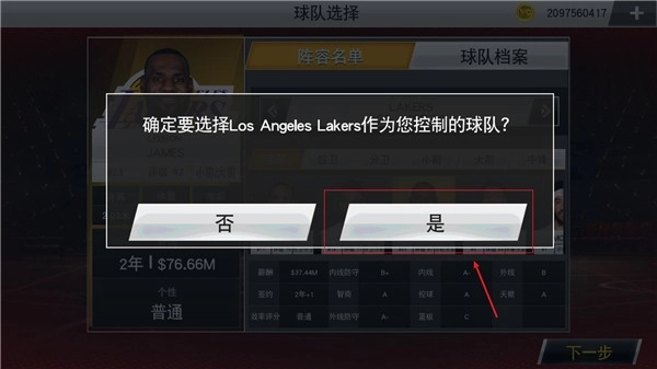 5、确认好你的球队,这边我们选的是湖人队。