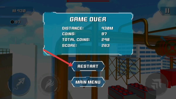 4、倘若挑战失败,将会出现 GAMEOVER 界面,该界面会显示距离、金币、总分等信息,点击“RESTART”即可重新开启挑战。