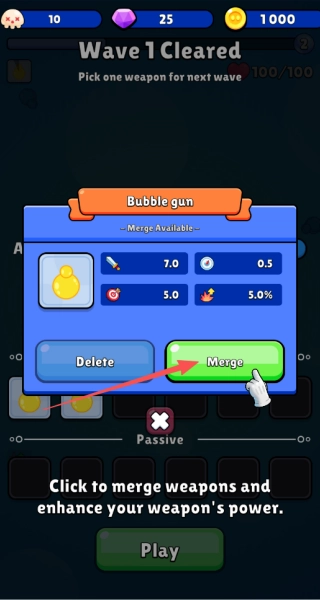 3、当碰到相同武器时,点击合成按钮,能够全方位提升攻击力与攻击速度属性。