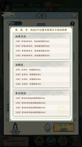 功法上可选择青元剑诀、血炼大法、千幻迷魂这几种,能进一步强化连击、吸血效果,或是偏向暴力的击晕属性。