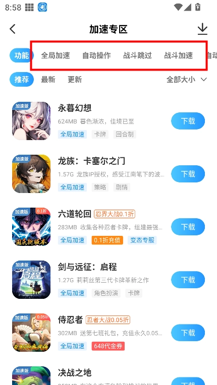 可以选择不同游戏加速内容
