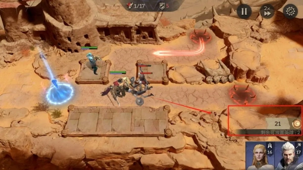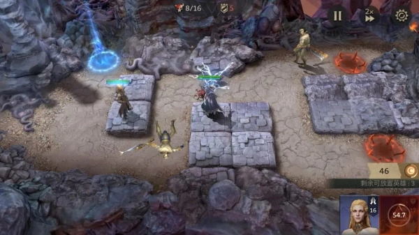 游戏前期的节奏非常快,要是操作不太熟练的玩家,推荐先用1倍速开始游戏。要是用2倍速的话,可能敌人都快要攻过来了,你还没来得及把英雄部署好。建议先放置坦克英雄,接着再安排输出和辅助英雄。