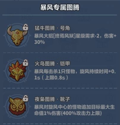 暴风的专属图腾具备以下几种效果:其一为「提升旋风伤害」;其二是「增加旋风持续时间」;其三是「大招星级需求降低且伤害增加」 。