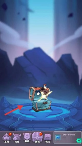 在关卡场景中进行宝箱探索,点击发光的宝箱即可开启并获取资源,以此推进主线(主城英雄锻纹)玩法。