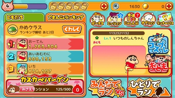 《蜡笔小新跑酷》正版是以日本国民级动画片《蜡笔小新》为蓝本改编的跑酷游戏。该正版游戏支持切换为中文,为看不懂日文的玩家提供了便利。在游戏中,能看到众多动画片里的角色,像小新、风间、正南以及阿呆等。玩家还能挑选不同的动画人物进行跑酷闯关,通过简单的操作方式助力角色跑酷,躲避各类障碍,收集道具,进而刷新跑酷的最高纪录。