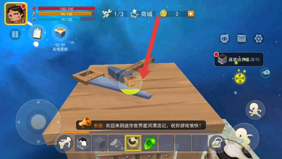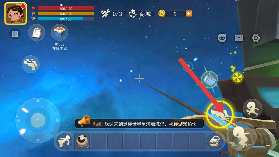 在创造模式中进行操作与自由建造时,进入该模式后,可借助方向控制器来控制角色的移动,通过拖动右侧屏幕来调整视角;点击“喷射塞子”能够吸引太空中的漂浮物,并且在创造模式下资源是没有限制的。