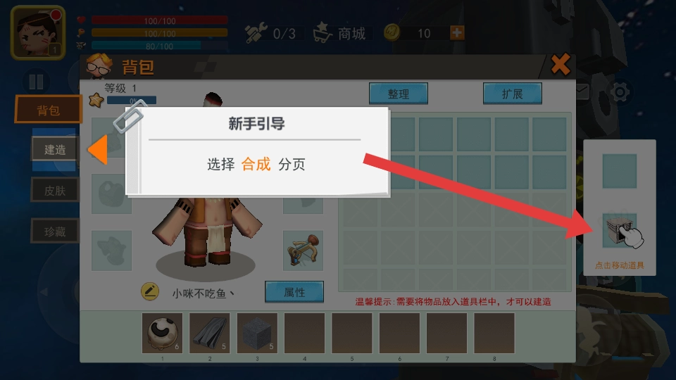 打开背包系统,查看初始获得的建造材料,点击材料图标选择使用,再点击场景空白区域即可放置材料。