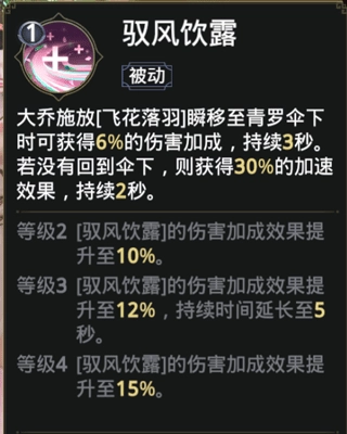 【飞花落羽】这个技能的效果是大乔向前抛出伞,伞会持续发射孔雀翎,对路径上的敌人造成伤害。
