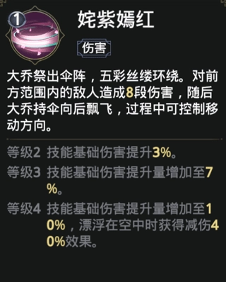 伤害技能【姹紫嫣红】,能够对前方一定范围内的敌人造成8段伤害,而且随着技能等级的提高,还可增加基础伤害与减伤效果。
