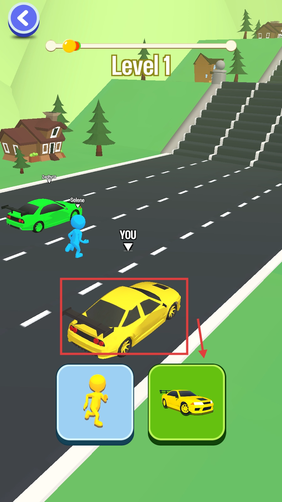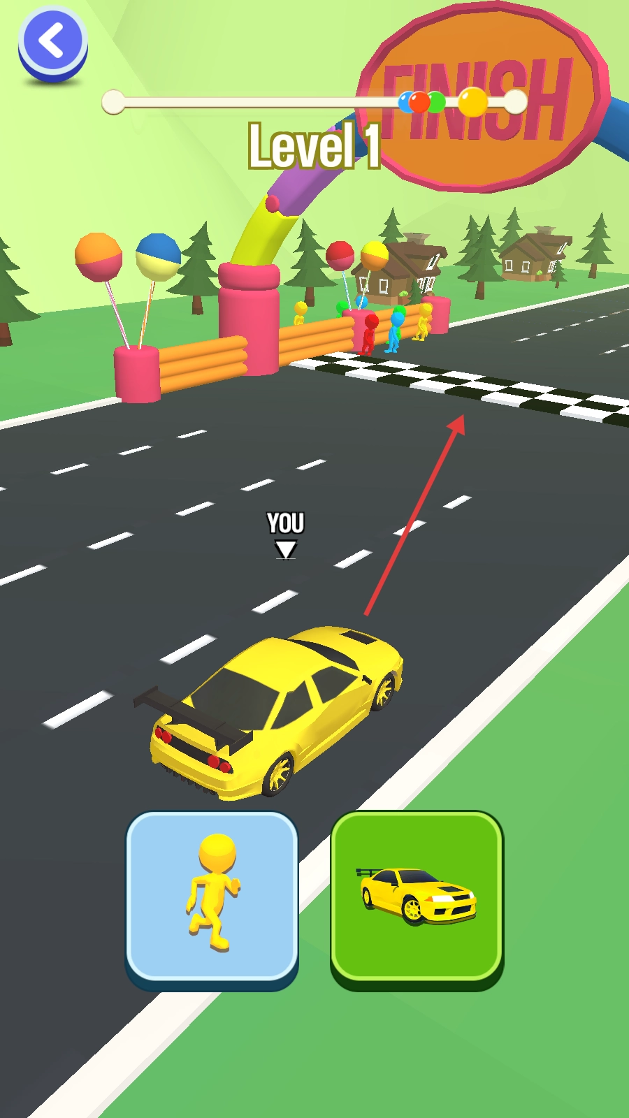 临近赛道终点时,切换回黄色汽车的形态,顺着道路全力加速,向着终点线冲刺,力求第一个抵达。