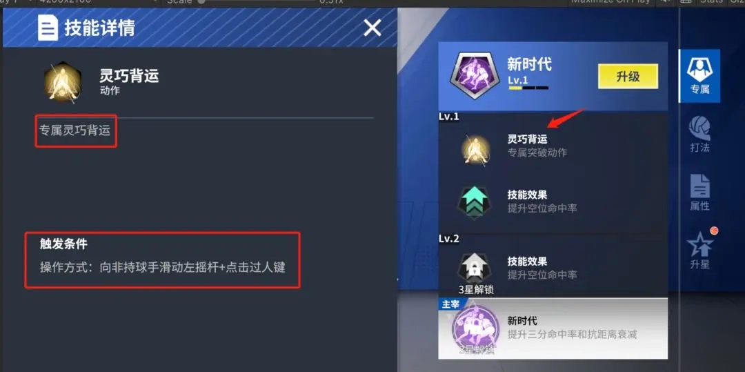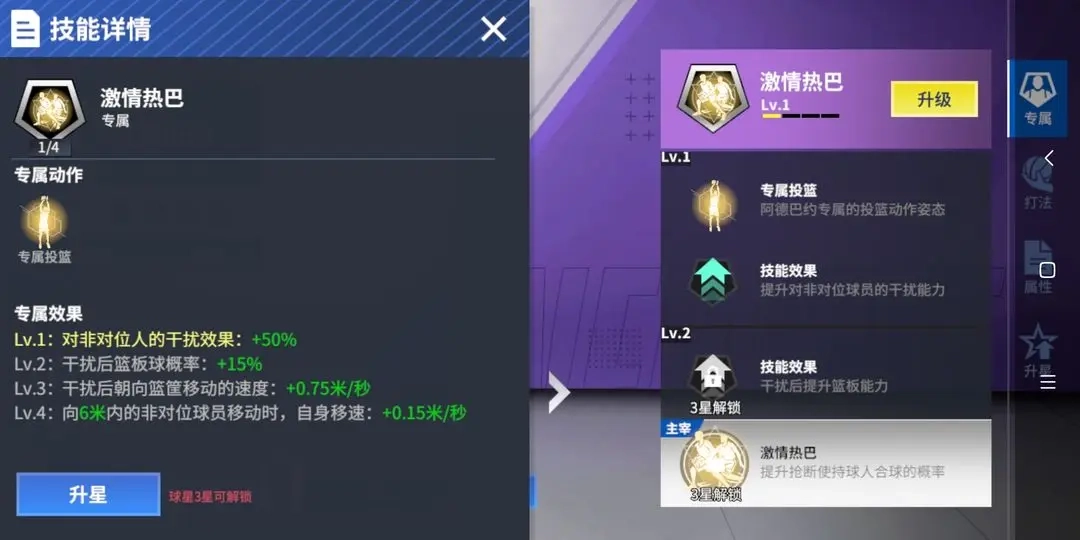 ①专属技能:在使用专属动作后,可提升脚踝能力与投篮能力,并减少体力消耗