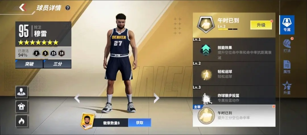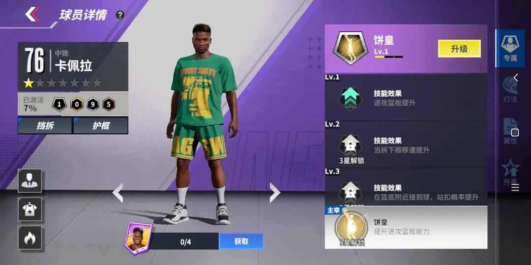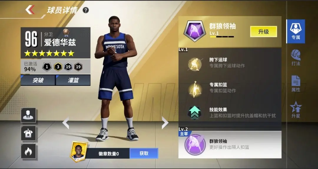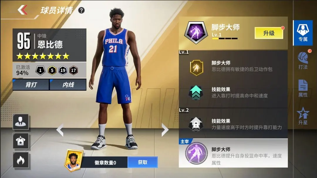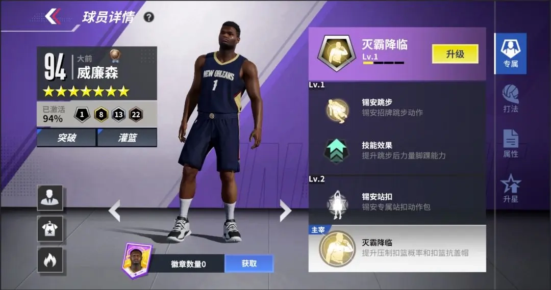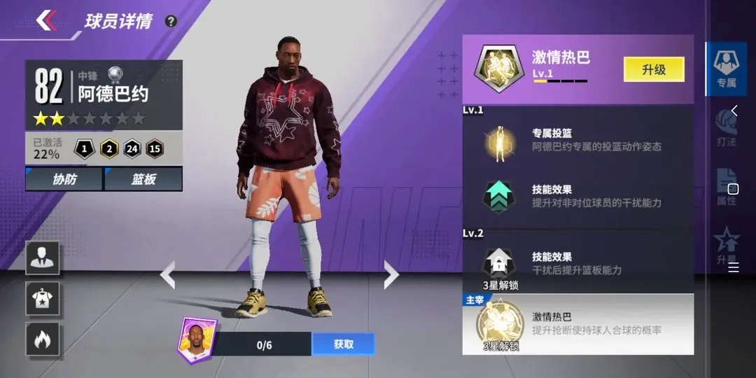 ①专属技能:增强跳步后的力量脚踝能力与扣篮能力,并提升其他相关属性