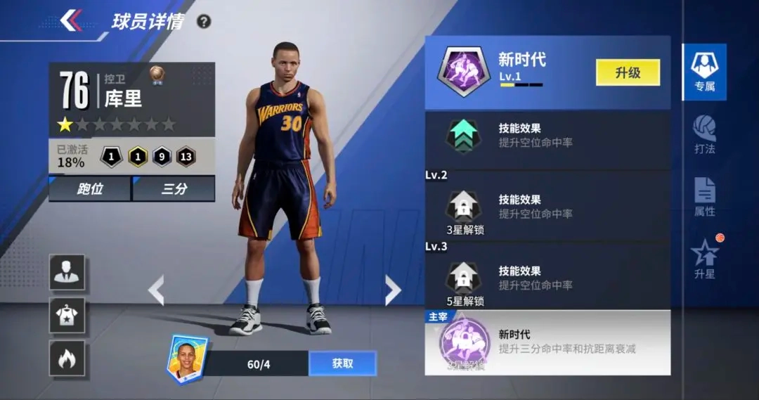 ○打法特色:新秀库里的星级提升至3星时,将解锁其专属主宰技能“新时代”。该技能开启后,不仅能提高远距离三分球的命中率,还会让他掌握后卫常用的实用后撤步投篮动作。