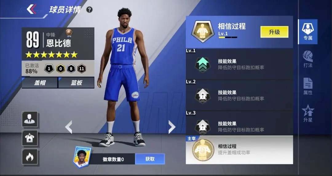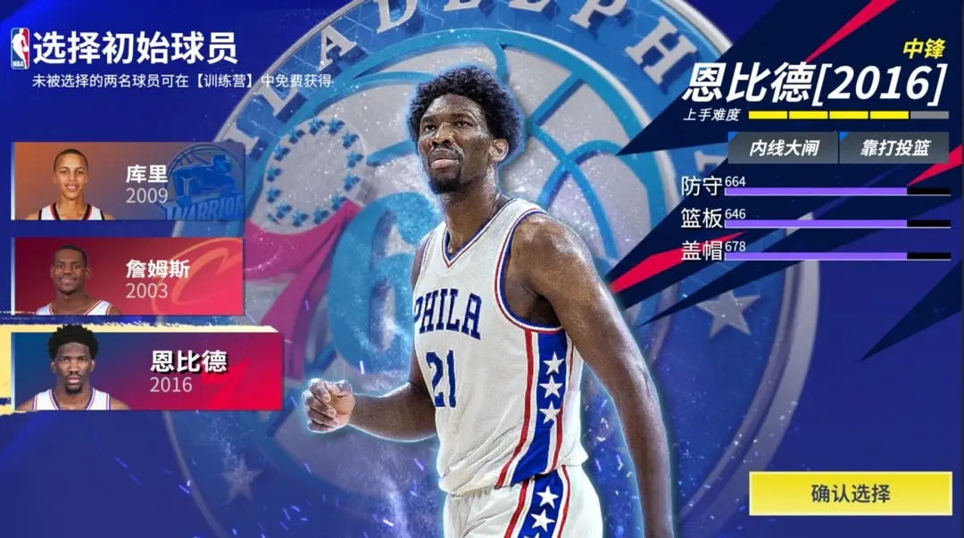 ○打法特点:1星恩比德的专属技能可降低防守对象的扣篮概率,是游戏开局应对新秀詹姆斯那些无脑暴扣的理想选择!