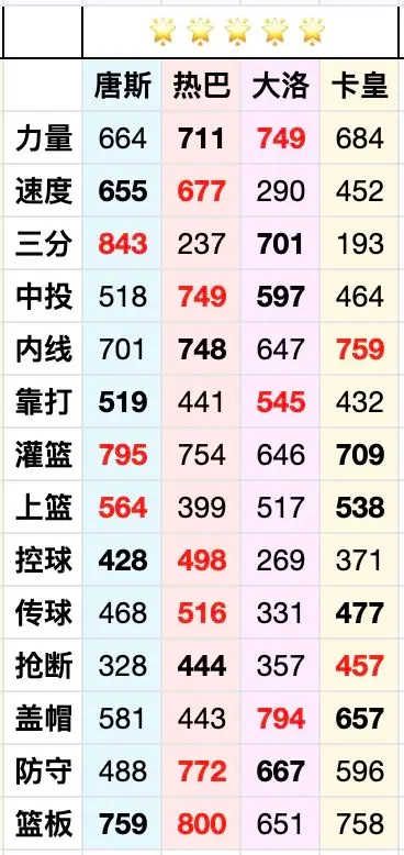 综合来看,热巴在多项数据上表现突出,尤其是关键的篮板数据,唐斯和大洛紧随其后,卡皇则排名垫底。