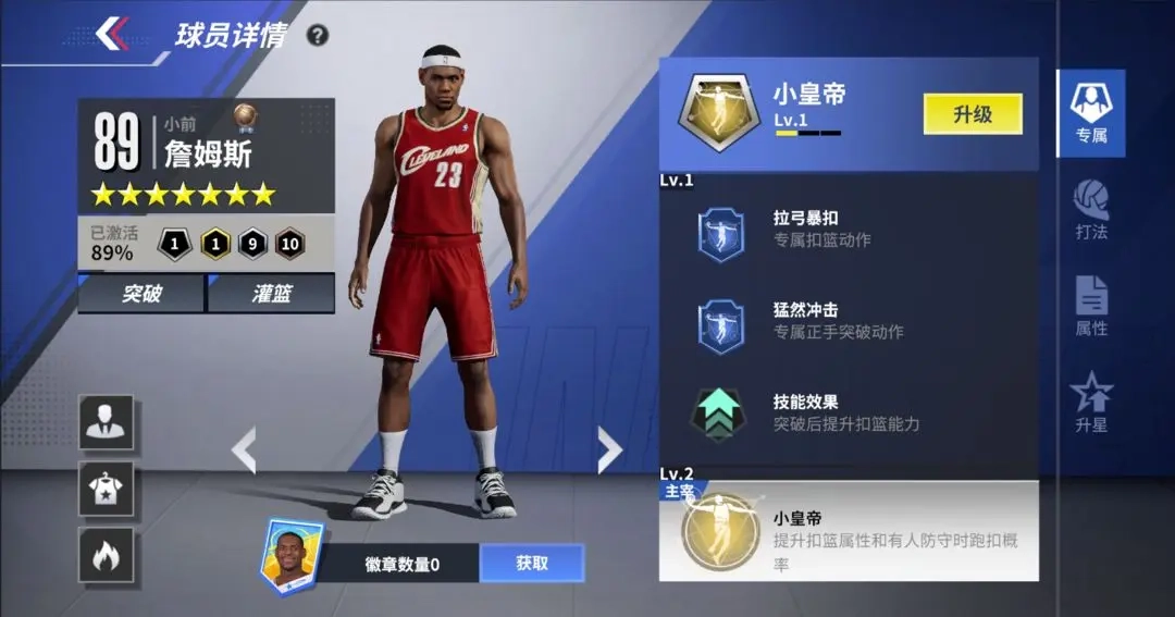 ○打法特点:新秀詹姆斯升至3星后将解锁主宰技能,能进一步增强扣篮属性以及有人防守情况下的扣篮概率;不仅如此,3星的新秀詹姆斯还会解锁篮下金刚技能,在篮下区域也具备更高的强起扣篮几率。