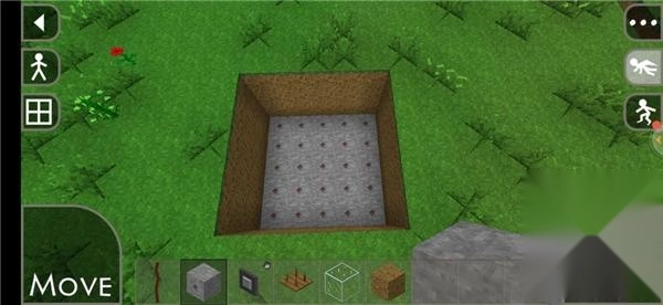 首先挖一个大小随意的坑,以5×5的大小做演示,往下挖四格以后再最底下一层铺上穿线石。