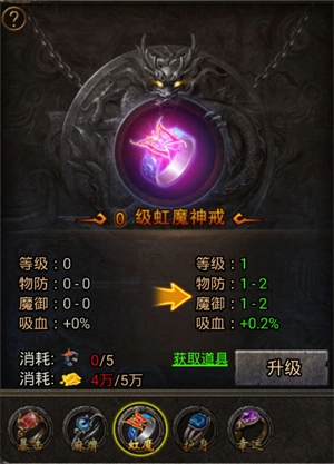 使用虹魔碎片能够提升虹魔神戒的等级,从而增加物理攻击、双防以及吸血属性。