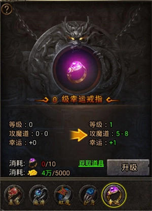 每提升一点幸运值,将增加3%的概率触发攻击、魔法、道术的上限效果,幸运神戒最多可提供+20的幸运加成(该加成能够与通过其他方式获取的幸运值叠加),而物理防御和魔法防御属性的上下限则不会因此受到任何影响。