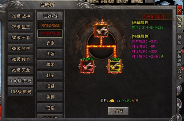 用三件传奇装备进行合成,有95%的概率得到神话装备,剩下5%的概率则会合成出至尊装备。