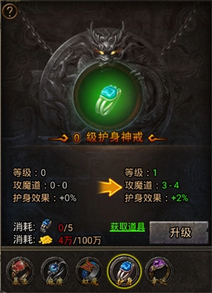 使用护身碎片能够提升护身神戒的等级,进而增加物理攻击、血量上限以及护身效果这几项属性。