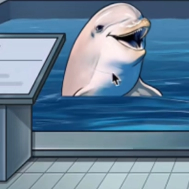 接下来点击铁桶,向右滑动饲养员的腿部,就会出现海豚的尾巴和角。