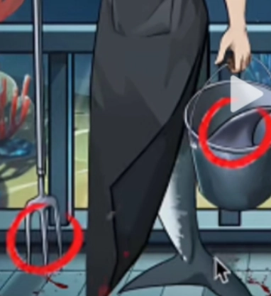 接着点击水族馆里的海豚,之后再点击地面上的血迹以及饲养员手中的叉子。