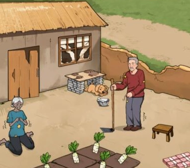 拖动爷爷到按摩椅,再拖动钱到地上锄头。