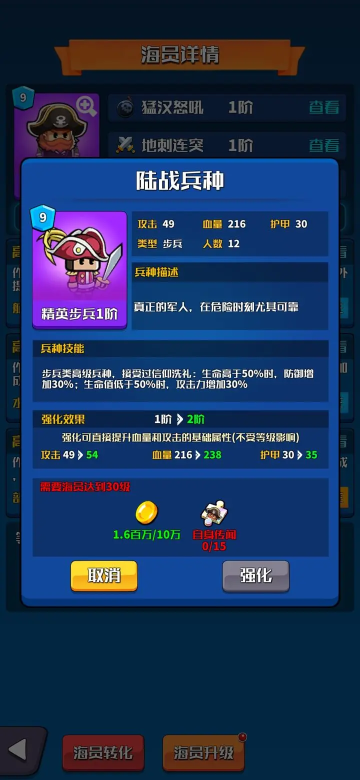 除了步兵和盾兵外,其他兵种都没有护甲!因此前排位置上步兵的生存能力更强,是不可或缺的存在。要是航海士属于零氪、微氪玩家,或者运气欠佳没能抽到合适的卡牌,那么可以先提升其他探险队长的等级——只要比推荐等级高出2级,并且多配置1队,就能轻松应对并碾压对手了。