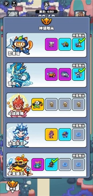 前期幸运币优先抽取核心配方“刺客”,后期则全部投入到强化忍者猫上;金币的主要用途是召唤随从,前期白蓝品质随从升到3级,紫色品质升到2级,期间获得的地精大炮和火枪手要全部保留,不要进行合成,留着后续组合出忍者猫。这套阵容的上限较高,但下限也很低,需要一定的运气和临场判断能力;在战斗之外可以解锁新的神话随从,这能大幅降低该流派的达成难度。