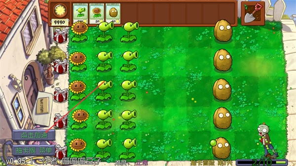 2、这是抽卡冒险关卡的内界面,通过种植向日葵来收集阳光,接着种植豌豆射手攻击僵尸,用坚果进行阻挡,点击加速按钮就能让进程加快。