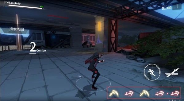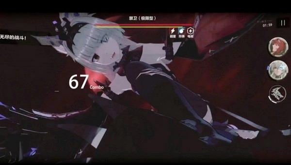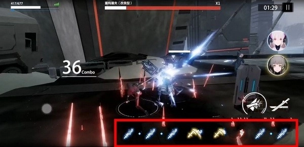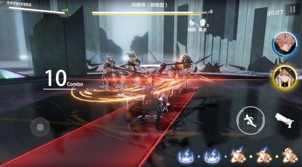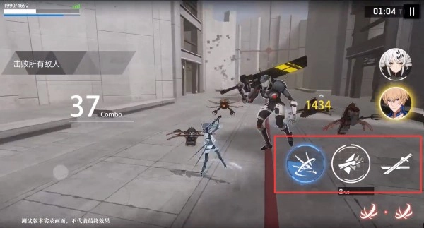 战双帕弥什的战斗界面右下角,红框里有三个按键,依次是必杀技、普攻与闪避,其中必杀技按钮要等能量条填满后才会显示出来。