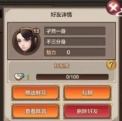 在好友界面,玩家能够开展私聊、赠送或领取耐力的操作;点击好友头像后,可选择赠送鲜花、查看阵容、进行私聊、删除好友、查看好友度等功能选项。
