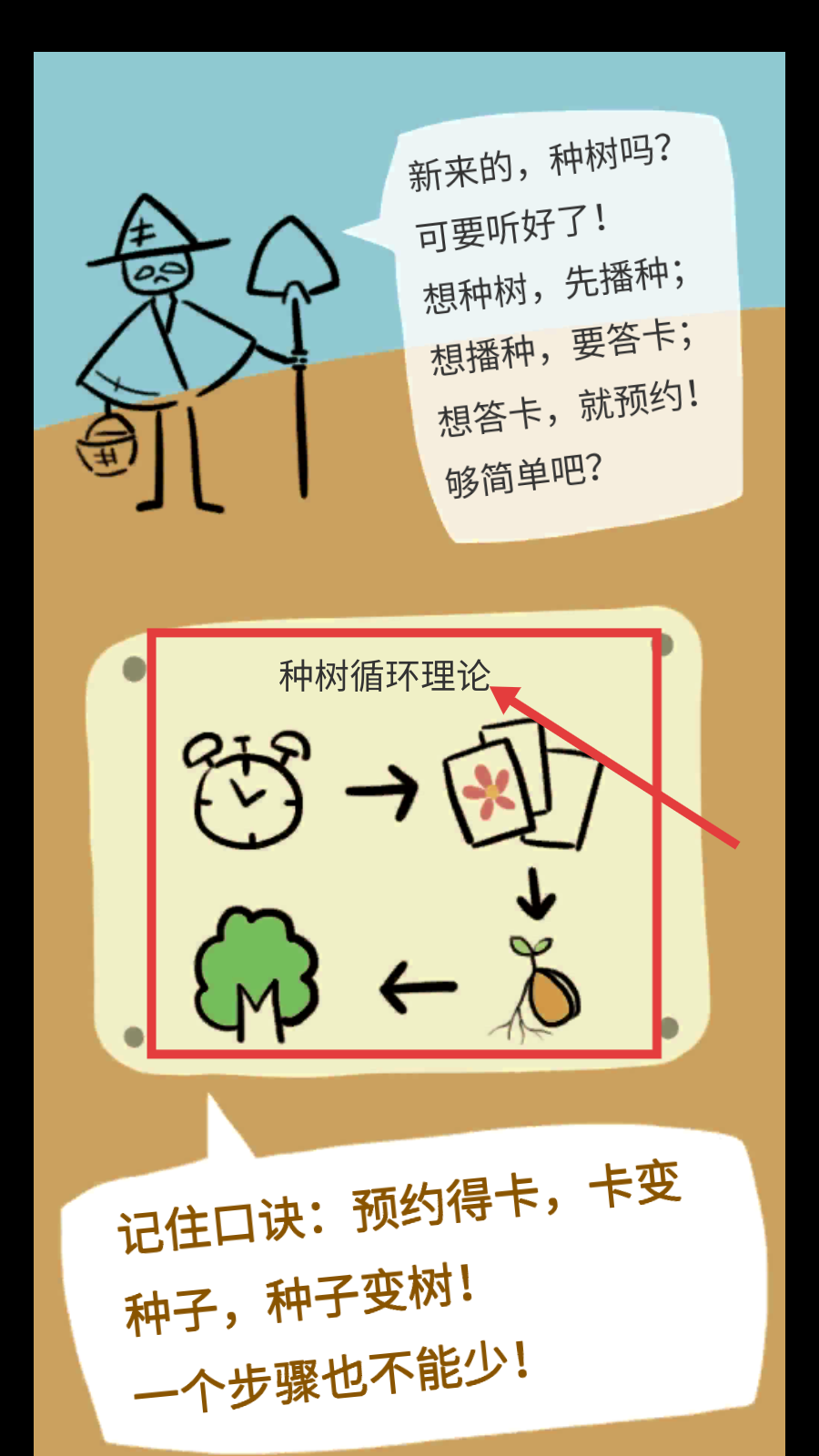 1、种树前得先把【种树循环理论】记牢,得按照预约、领卡、种子转化、培育成树这几个步骤来,每一步都不能落下。